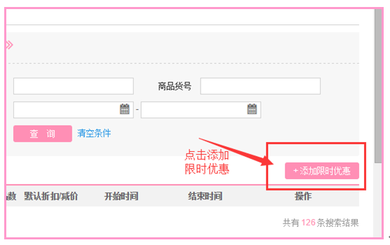 我們拿限時(shí)折扣活動(dòng)類(lèi)型進(jìn)行添加商品演示(限時(shí)減價(jià)類(lèi)型類(lèi)似,只不過(guò)把折扣輸入變?yōu)闇p價(jià)輸入即可,不再詳述)