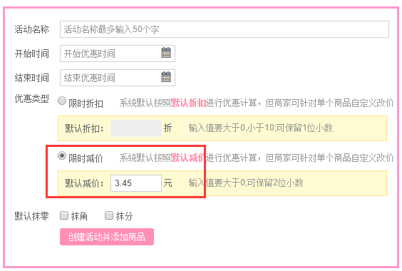 1)此種活動(dòng)類(lèi)型,是本次新增的一種活動(dòng)類(lèi)型。建立活動(dòng)填寫(xiě)默認(rèn)減價(jià),則活動(dòng)添加商品都會(huì)按照默認(rèn)減價(jià)進(jìn)行優(yōu)惠計(jì)算(當(dāng)然商家可針對(duì)每個(gè)商品設(shè)置不同減價(jià))
