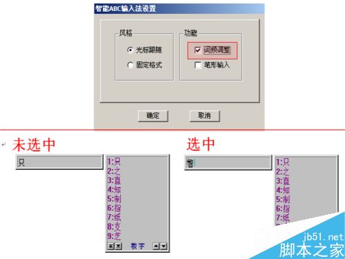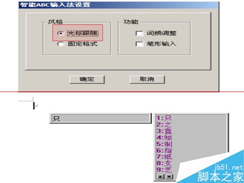 2、設(shè)置中有風(fēng)格與功能兩個選項。風(fēng)格中有光標(biāo)跟隨與固定格式。功能中有詞頻調(diào)整與筆形輸入。
