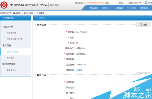 客運首頁-我的12306-個人信息-查看個人信息: 仔細核對每一項信息