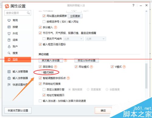 5、我們注意到在該項里的"i模式換膚"前面是被選中的狀態,我們將前面的勾去掉然后點擊確定,再次輸入的時候按i鍵就看不到換膚窗口了