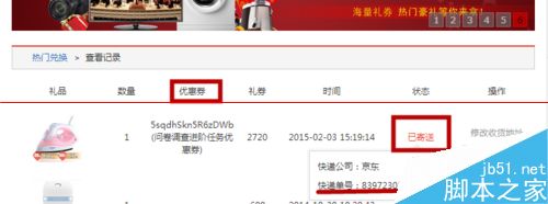 7、大概5天后,我們再次登錄百度眾測,進入”禮品中心“--”查看記錄“里,=查看,我們可以看到優惠券已使用,快遞“已寄送”,下方還可以看到快遞單號,我們可以自己在網上查看物流情況