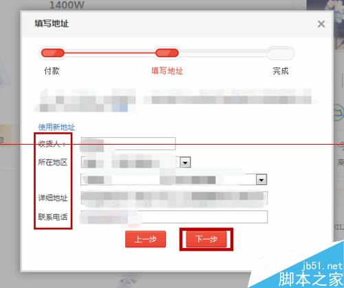 5、填寫相應的地址和聯系號碼,完成后,點擊”下一步“