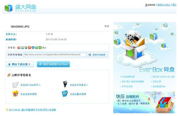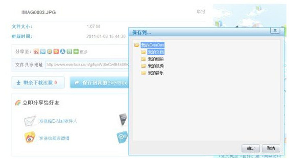 注意:每個文件可以無限制的下載5次(點擊彈出下載保存框算一次),次數為0后,EverBox的注冊用戶仍可隨意下載(注冊EverBox很方面,而且是免費的)。另外,注冊用戶還可以把這個文件轉存到自己的EverBox網盤里,點擊“保存到我的EverBox”,然后選擇保存位置就可以了。轉存到自己的網盤,不用擔心找不到或者丟失了。