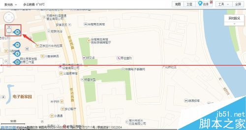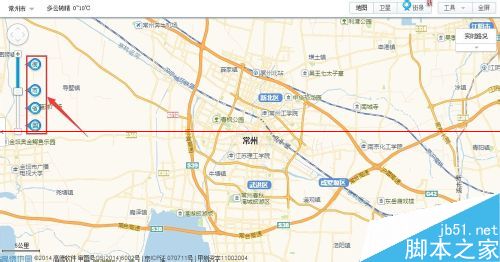 2、當(dāng)鼠標(biāo)移動(dòng)到地圖左邊的縮放工具時(shí),在縮放工具上會(huì)依次顯示街、市、省、國,將地圖放大到街,如圖所示: