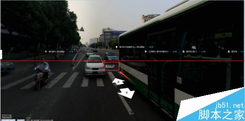 4、點(diǎn)擊藍(lán)色道路后進(jìn)入街景,在街景的右下角有小地圖標(biāo)注你的位置,在街景中可以點(diǎn)擊大箭頭來前進(jìn)和后退,也可以直接在地圖中點(diǎn)擊鼠標(biāo)來前進(jìn),如圖所示: