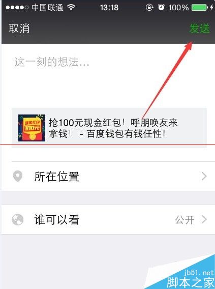 5、我們以分享到微信朋友圈為例。可以選擇直接發(fā)送到朋友圈,如下圖所示。輸入你要說的話,點擊發(fā)送即可。