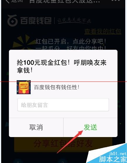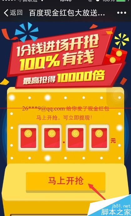 8、成功發(fā)送之后,你可以從這些平臺進入你發(fā)的紅包頁面,點擊“馬上開搶”就可以搶到紅包了。這里還是會要求你輸入百度賬號,綁定銀行卡。