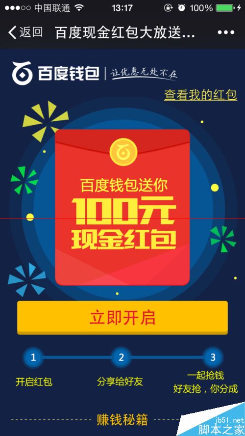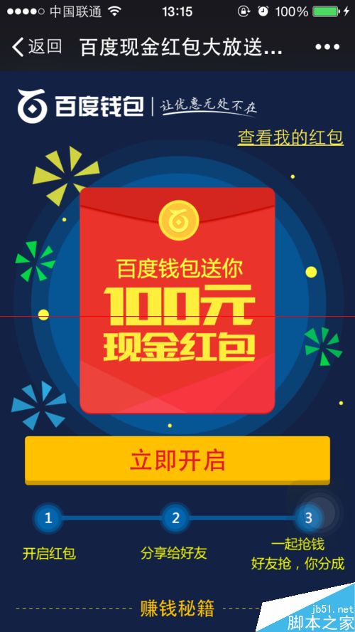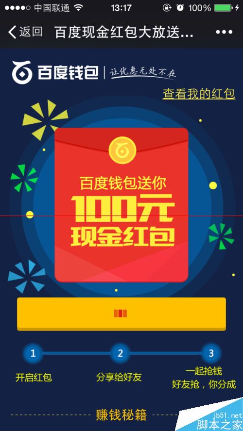 百度為了推廣他的百度錢包真是下了血本了。現(xiàn)在隨意就發(fā)100元的紅包給大家搶。