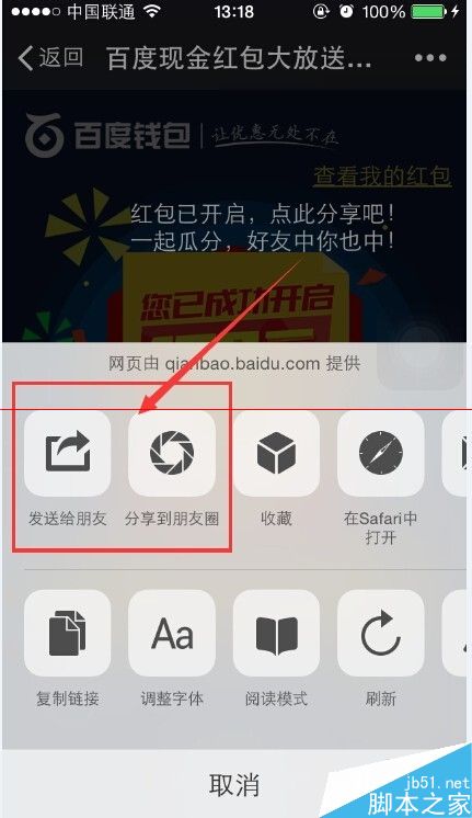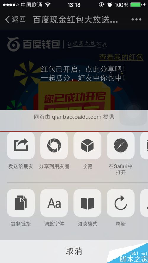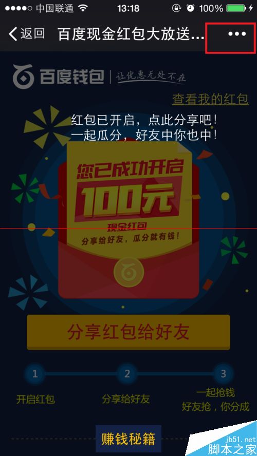 4、紅包成功開啟后,需要分享到公共平臺才能夠搶紅包。如下圖所示,地阿基右上角的“三個點”,彈出可以分享到的平臺選項。