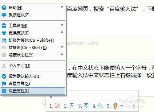 2、安裝好后,在中文狀態(tài)下隨便輸入一個字母,然后選擇右擊——設(shè)置屬性,或是直接百度輸入法中文狀態(tài)欄上右鍵選擇“設(shè)置屬性”,如下圖: