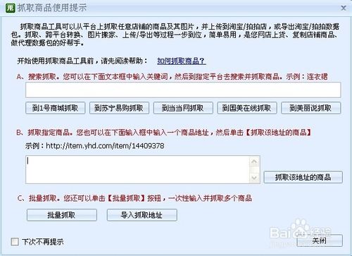 11、除抓取美麗說(shuō)平臺(tái)的商品,還可一鍵抓取拍拍、淘寶、JD、國(guó)美、蘇寧等等大型網(wǎng)上商城平臺(tái)中任意的商品,若需要抓取其他平臺(tái)商品,可參考其他抓取教程。