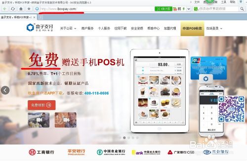 1、首先,百度 盒子支付,打開盒子支付的網站后,看到中間切換的廣告,等到如下的界面,點擊”免費領取“,或者直接點擊網頁上方導航欄的"申請POS收款",進入進行申請即可.