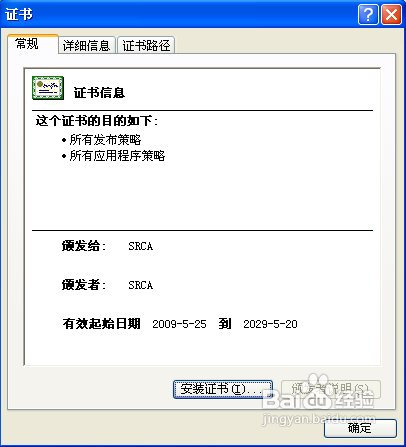 5、雙擊壓縮包內(nèi)的srcr.cer根證書文件,就會(huì)出現(xiàn)如下提示: