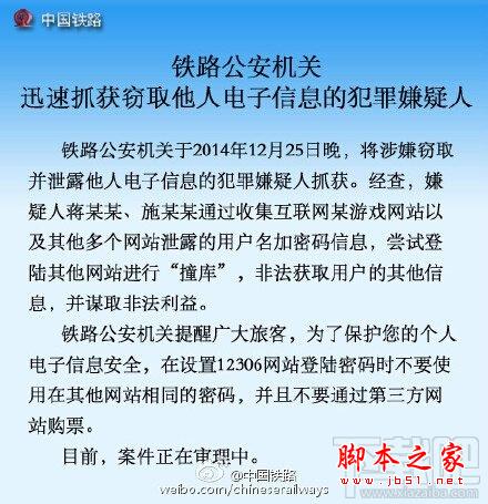 中國鐵路官方微博發布消息,確認12月25日晚將涉嫌人被抓。