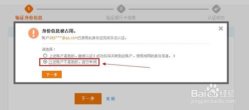 選擇“上述賬戶不是我的,進(jìn)行申訴”,如果這個賬戶是你的,建議你選擇第一條,因?yàn)橐坏┥矸葑C被占用申訴成功,之前實(shí)名認(rèn)證的賬戶將被凍結(jié)!!!再次強(qiáng)調(diào)一下。