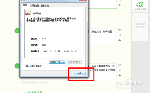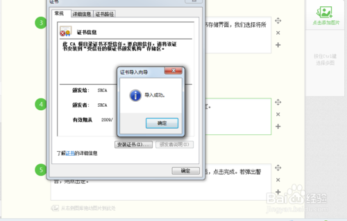6、這個時候,跳出導入成功提示,點擊是,關閉導入向導。這個時候,返回證書安裝界面,點擊確定,這樣,你就完成了根證書的安裝。再次購票的時候,就不會出現錯誤或者是無法購票的現象了。