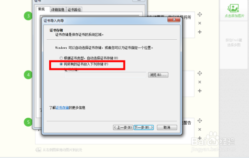 3、這個時候,會有向導,我們再次按照要求,點擊下一步。彈出證書存儲界面,我們選擇將所有證書放入下列存儲。點擊瀏覽,選擇一個存放。