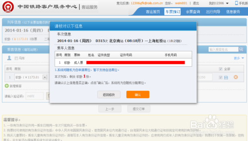 5、這個時候,跳轉到你已經提交的定單上,需要你仔細核對一下你的訂票的信息,記得,如果是多張的話,需要你一個一個地核對。不要出現錯誤。如果沒有錯的話,點擊確定。