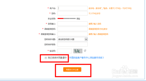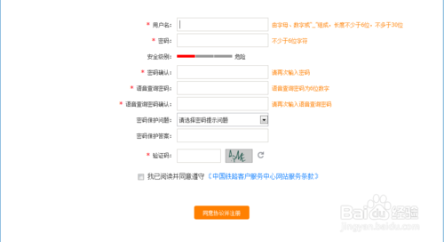 3、再進入新頁面后,就是新用戶的注冊頁面,這個時候,按照上面的要求,把其填寫完整,記得,帶有星號的填寫項,必須填寫。密碼是數字和字母混亂使用的,不認單純的字母或者是數字。而且注冊的時候,要記得,把自己的身份證號碼和手機號碼寫對了。因為這是一對一的,不能更改的。