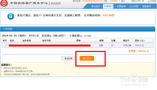 在購買火車票的時候,因為我們查到了有票,就要在42分鐘內進行購票,所以,一定要記得,這個時候,需要你的網銀里有錢,才能保證你的購票的成功。所以,提前兩三天把錢存進銀行卡。如果是支付寶的話,也需要提前從卡里把錢打到支付寶。