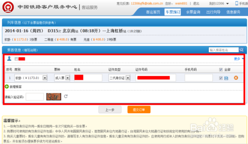 4、找一班列車,是符合你所有要求的,點擊一下后面的預定,這個時候,頁面又跳轉到預定的頁面中。這個時候,需要你填寫定票人的信息,席別,就是座位的等級,輸入身份證號碼等。如果你是多張購買的話,需要多次輸入不同人的身份證號,也可以從常用聯系人那里加上他們的購買信息。填好后,再點擊提交訂單。