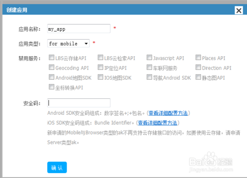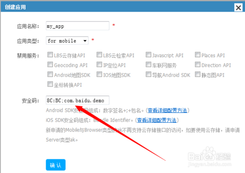 6、然后復制在安全碼里面,+;+包名,這里的包名要與你程序中的包名所一致。到這里基本就大功告成了,確定之后開始你的開發之路吧。