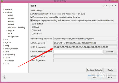 5、而最重要的就是下面安全碼的填寫了,數字簽名可以通過打開Eclipse的首選項查看,而不用命令查看那么麻煩。如圖箭頭所指就是sha1值。