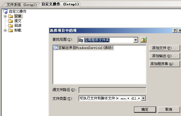 上面有兩點需要注意 ,一 項目選擇中選擇要安裝的服務, 二 項目選擇下面要選擇主輸出,選擇好后確定,這一步增加了安裝程序的文件夾,下一步就是給這個安裝程序增加操作,這里我們增加兩個基本操作,一個是安裝,一個是卸載。安裝項目(右擊) ——> 視圖 ——> 自定義操作 如圖
