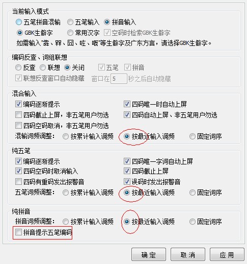 第五個“純拼音”:詞頻調整選擇“按最近輸入調頻”【注意勾選“拼音提示五筆編碼”】適合剛計劃學習五筆的用戶。【最后“確認”】