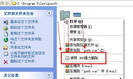 打開光速的默認安裝路徑【C:/Program Files/Gsoft】,找到【gswb】文件夾,在文件夾上右鍵選擇【使用360強力刪除】
