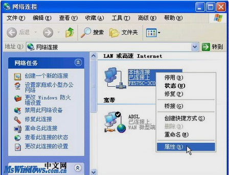 2、打開“網絡連接”窗口,右鍵單擊“本地連接”圖標,選擇“屬性”命令