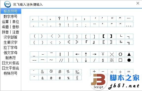 特殊符號輸入:點擊特殊符號輸入進入訊飛輸入法特殊符號面板,您可以隨心快捷輸入特殊符號,如下圖: