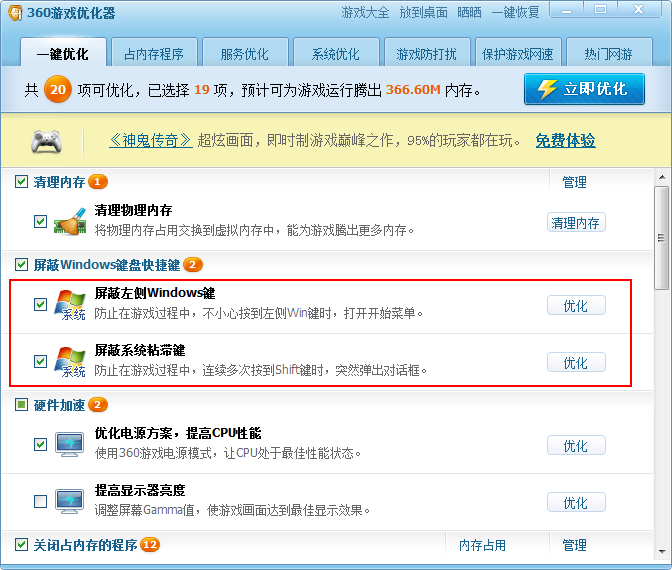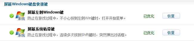3、進(jìn)入游戲優(yōu)化器界面后我們可以看到當(dāng)前可以為游戲進(jìn)行優(yōu)化的選項(xiàng),其中兩項(xiàng)就是屏蔽左側(cè)windows鍵和屏蔽系統(tǒng)粘滯鍵,這兩個(gè)就是造成以上情況的原因了,我們可以把這兩個(gè)都給屏蔽了。