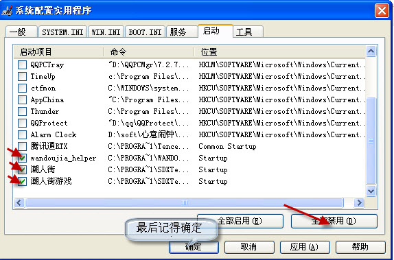 4.勾選你不需要開機啟動的選項,點擊“全部禁用”確定就可以啦!