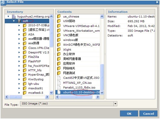 在彈出的窗口中選擇前期新建的DataStore,如果前面沒有新建,這里是找不到iso文件的,這點server與wrorkstation不一樣。