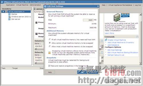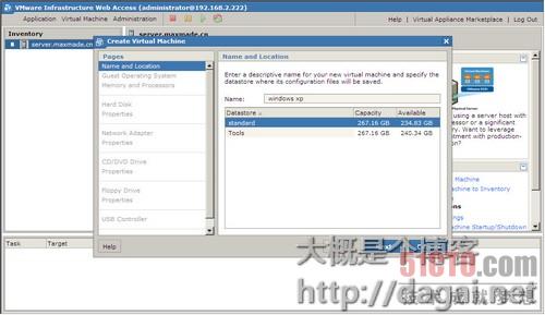 概要里顯示了當前虛擬機的配置信息,需要注意的是這里有個Datastores,怎么翻譯呢?數據倉庫?在virutal server對應的功能應該是"搜索路徑"吧,但VMware server里的datastores很顯然跟virtual server的搜索路徑不一樣,比如指定一個光盤映像,在virtual server中不設置"搜索路徑"可以直接輸入絕對路徑就可以了,而在VMware server不設置datastores使用絕對路徑是無法使用的。這么理解吧,Vritual PC與VMware workstation使用光盤映像可以直接找到光盤位置使用就行了,但VMware server不是,所使用的映像必須是datastores里的,默認datastores里有個叫standard的datastore,至于怎么添加其他的路徑到datastores里稍后再說。