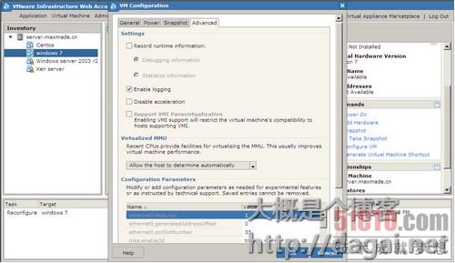 Unit),虛擬內存管理單元,說是有些新的CPU支持,老夫也不知道,三個選擇,第一個是讓虛擬機自動選擇,第二個是當CPU支持的時候強制使用,第三個是不使用。最下面是配置參數,太他媽深奧了,老夫根本搞不清楚,可以添加或編輯這些參數,直接飄過。