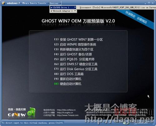 設備菜單呢,還記得之前添加虛擬機硬件的時候,有些硬件有個選項是是否在啟動的時候連接,這里就是控制這些設備連接和斷開的。當然,每次虛擬機重新打開的時候,這些設備的連接狀態還是你在設置虛擬機的時候選擇的狀態。左下角有一句話,這個是提示虛擬機鼠標獨占和釋放獨占的快捷鍵,按Ctrl+G鍵,鼠標就被虛擬機獨占了,這時鼠標只能在虛擬機范圍內使用,如果要釋放鼠標,按Ctrl+Alt鍵就行了,左右的都行,在安裝完系統再安裝了Vmware