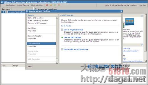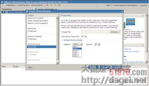 選擇使用ISO光盤映像就要選擇映像的位置,這個映像的位置必須是在Datastores里添加過的,否則沒法使用,選擇讓光驅在系統啟動的時候自動連接,再選擇接口類型SCSI或IDE,默認IDE就行了,繼續下一步,