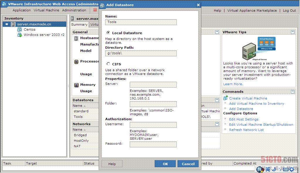 現在點Add Datastore來添加一個datastore,給添加的datastore取個名,第二行是添加本地的datastore,輸入路徑就行了,如果要添加網絡上的datastore就要選擇CIFS了,服務器、路徑、用戶名密碼,很簡單了