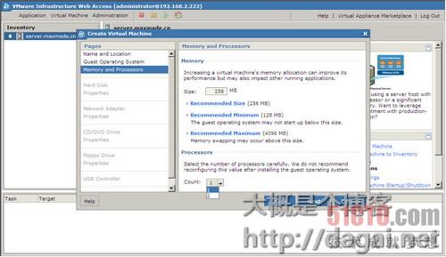 下面Processors是選擇cpu的個數,必須主機是雙核或超線程的處理器可選擇兩個以上CPU,否則只有一個,奇怪了,我主機是四核至強,這里怎么只有兩個呢?