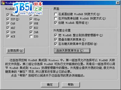 圖2 設(shè)置關(guān)聯(lián)等 圖2 中分三個(gè)部分,您在左邊的“WinRAR關(guān)聯(lián)文件”是讓您將下面的格式的文件創(chuàng)建聯(lián)系,如果您決定經(jīng)常使用 WinRAR 的話,可以與所有格式的文件創(chuàng)建聯(lián)系。如果您是偶然使用 WinRAR 的話,也可以酌情選擇。右邊的“界面”是選擇 WinRAR 在 windows 中的位置。“外殼整合設(shè)置”是在右鍵菜單等處創(chuàng)建快捷。都做好選擇后,點(diǎn)“確定”就會(huì)出現(xiàn)圖3,點(diǎn)擊“完成”成功安裝。