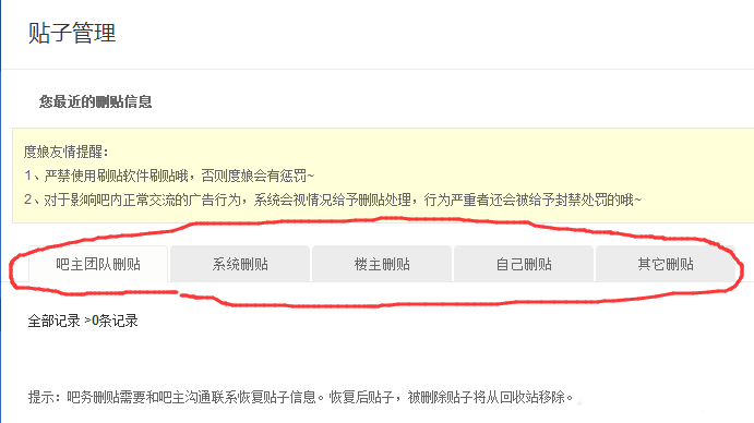 2、進(jìn)入服務(wù)中心之后,左側(cè)導(dǎo)航欄里有個(gè)“刪帖回收站”,點(diǎn)進(jìn)去可以看到各類刪帖信息。