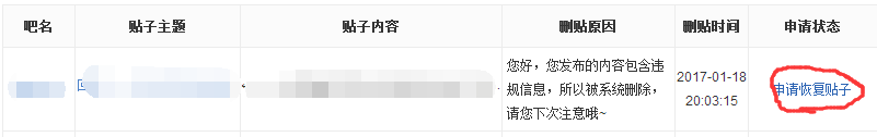 3、系統(tǒng)刪帖這里,如果你確定你的帖子沒有違反規(guī)定,可以點(diǎn)右邊的“申請(qǐng)恢復(fù)帖子”,提交人工申訴,審核通過之后就能恢復(fù)。理由像我這樣稍微填一下就可以了,字?jǐn)?shù)要滿20個(gè)。一般需要等待一兩天,據(jù)說超級(jí)會(huì)員(感覺度娘在挖空心思引誘我們開會(huì)員)的會(huì)優(yōu)先處理。