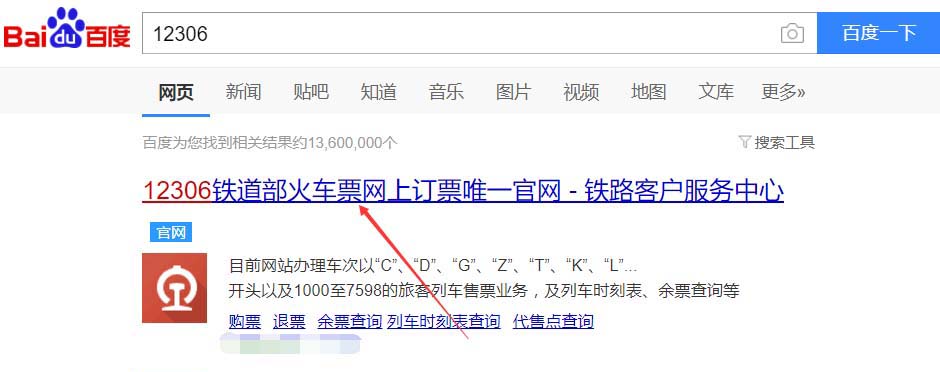 1、打開百度,直接搜索12306,然后點(diǎn)擊12306官方網(wǎng)址,如下圖所示。
