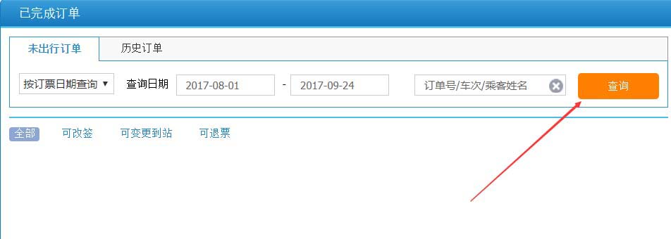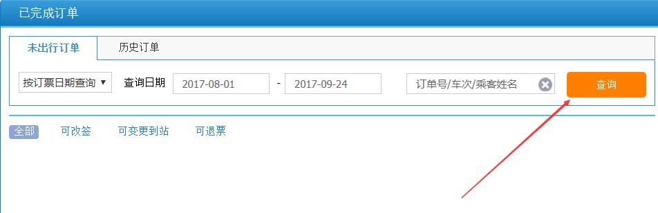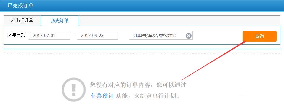 6、點(diǎn)擊歷史訂單可以查詢已經(jīng)出行的訂單,也是可以按照時(shí)間和訂票姓名來查詢,如下圖所示。