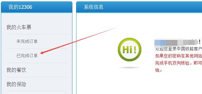4、登錄成功后,在個(gè)人中心頁面里,點(diǎn)擊右側(cè)我的火車票下面的已完成訂單,如下圖所示。
