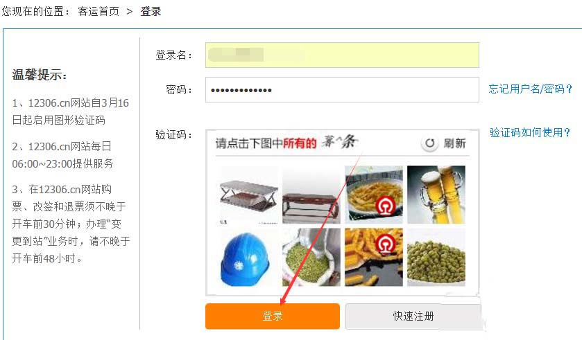 3、在12306登錄頁面上輸入用戶名和密碼,然后點(diǎn)擊登錄,如下圖所示。