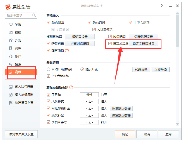 2、在搜狗輸入法屬性設置中找到“高級”分類,在高級分類里有一個“自定義短語”的功能,打開它,